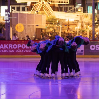 Žinoma, spektaklis neįvyktų ne tik be autorių, bet ir be dalyvių. Šį kartą subūrėme 40 čiuožėjų – prie Ledyno čiuožėjų prisijungė vaikai ir iš kitų mokyklų, o viena mergaitė kas savaitę atvykdavo netgi iš Kauno! Repeticijoms aukoti penktadienio vakarus, o vėliau ir savaitgalius, tikrai ne visada yra smagu, tačiau čiuožėjai gausiai rinkosi, mėgavosi procesu ir kantriai dirbo tikėdami procesu. O procesas buvo išties įdomus – nuo repeticijų salėje mokantis judesius ir skaičiuojant taktus, iki repeticijų ant ledo, mokantis viską perteikti čiuožiant. Klydome, taisėme, keitėme, tačiau nėsyk nesuabejojome savo idėja ir bendryste. Kartu čiuožė jauniausi ir vyriausi Ledyno čiuožėjai, į spektaklį buvo įtraukti tiek patyrę čiuožėjai, tiek atradę dailųjį čiuožimą vos prieš kelis mėnesius. Šie skirtumai tapo mūsų unikalumu, Amžinybės giria svetingai visus priėmusi suartino ir suvienijo. Vienas kito palaikymas, tikėjimas ir sėkmės linkėjimas mus lydėjo iki pat premjeros.